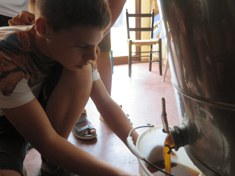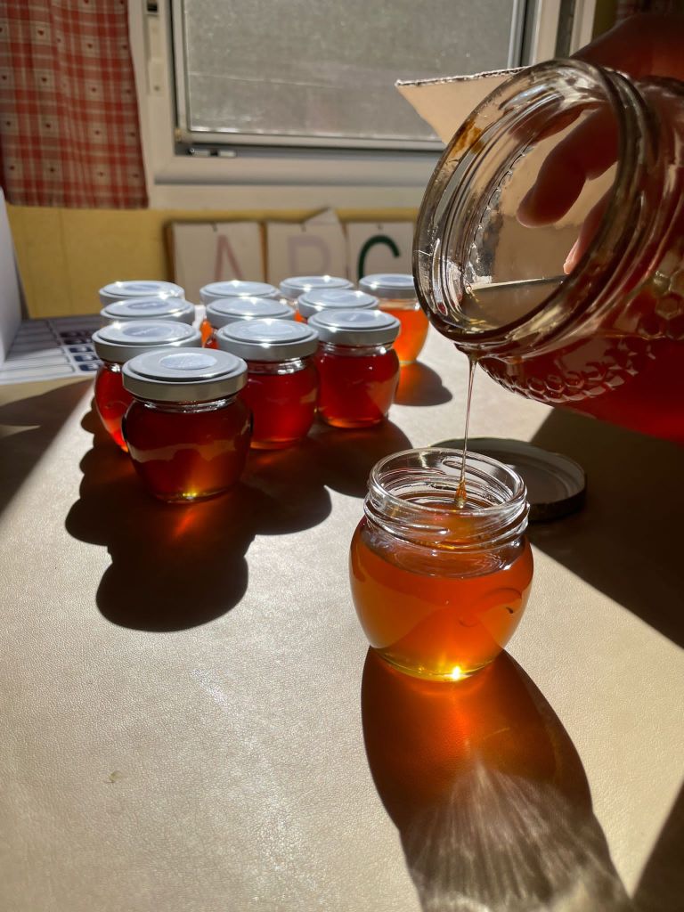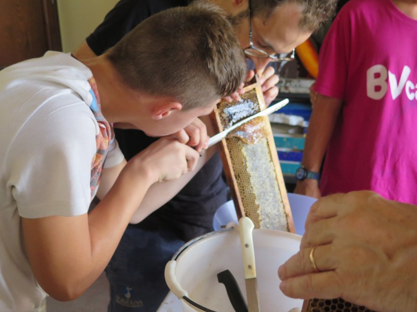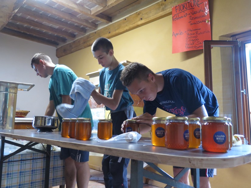 dell’acacia, si entra nel vivo della stagione produttiva, che richiede attenzione e coraggio, per scovare l’astuta regina in procinto di sciamare, o per affrontare con fermezza uno sciame di 50.000 operaie intente a difendere il loro prezioso nettare. Non tutti i ragazzi sono disposti ad affrontare questo lavoro, tanto avvincente quanto rischioso, ma il gruppo intero si riunisce con gioia nel giorno della smielatura: un’opera sinergica in cui pochi gesti elementari permettono a tutti di estrarre il miele dai favi, un autentico oro che cola, che colma vasi da chiudere e gustare a tempo debito.